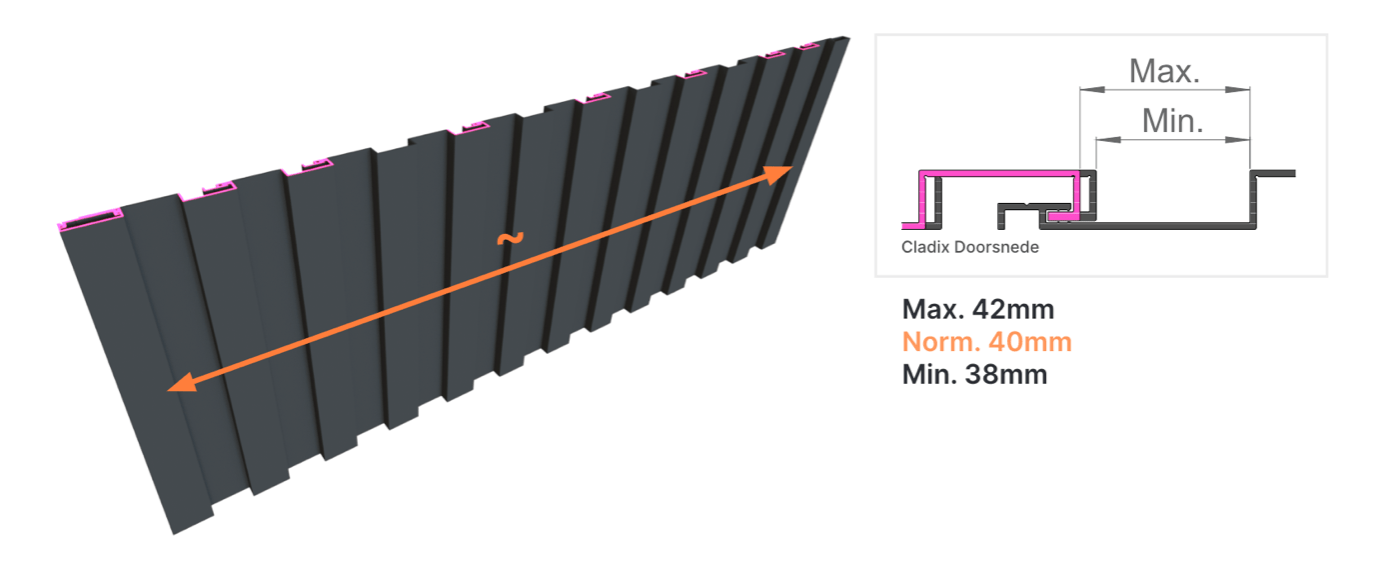 Het tand-haaksysteem zorgt ervoor dat de gevelbekleding perfect past op elke gevel. Met elke haakaansluiting kun je 2 mm naar links of rechts schuiven voor een perfecte uitlijning. Dit betekent dat je per profiel een speelruimte van 4 mm hebt. Het grote voordeel hiervan is dat je geen zaagsnedes nodig hebt in de langsrichting, wat de installatie nog eenvoudiger maakt.